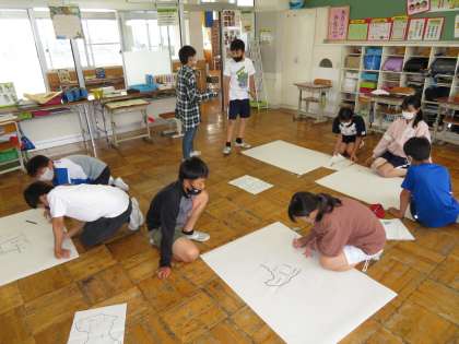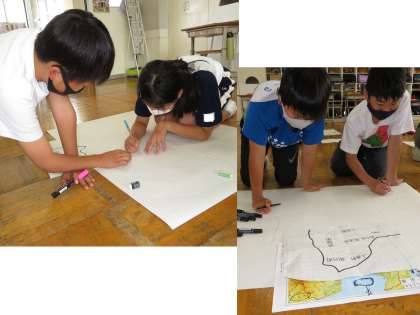 みんなで模造紙に富山県の地図を描き、どこまで進んだか地図上で確認すると、岩瀬浜まで北上した後、海岸沿いを西に向かって進み、現在地は氷見市の海沿いの道路付近ということが分かりました。