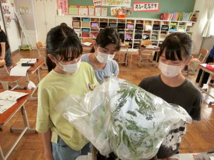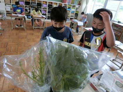 色水を使った植物の実験で、根から吸い上げた水が、茎、葉へと運ばれていくことが分かった6年生。今日は、葉に運ばれた水がどこに行くのかを調べる実験をしました。