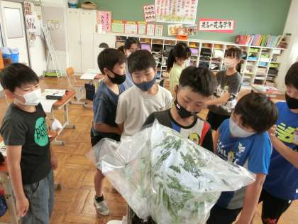 袋の内側に付いた水滴を見ながら考える子供たち。