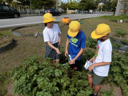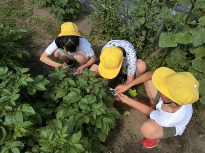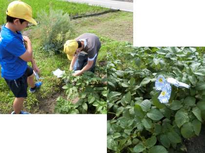 6年生は、明日の理科の実験のために、アルミ箔を持ってジャガイモ畑に向かいました。