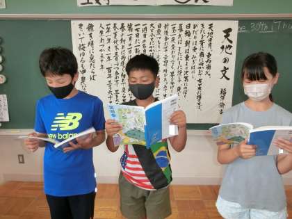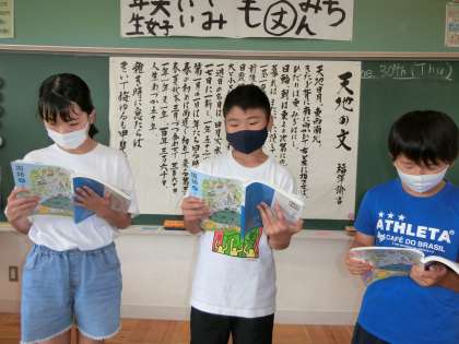 明治時代の初めに、福澤諭吉が子供の習字手本としてつくった「天地の文」を読む6年生。