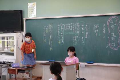 4年生は、国語科「新聞を作ろう」で自分たちが伝えたい話題の情報を集め、まとめています。今日は、できあがった新聞を誰がどうやって渡しに行くのか話し合いました。どうすればよいか自分たちで司会進行し、決めました。