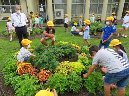 彩り豊かな花壇にするために、しっかり花摘みを行い、終業式へ。