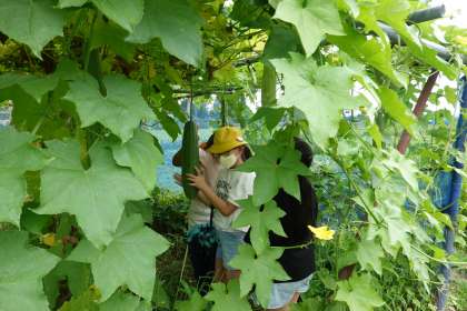夏休みを終えて、畑のヘチマが大きく育った姿に、子供達は大喜びでした。大きなヘチマの実に驚きながら、花の様子や実のなる様子を観察しました。