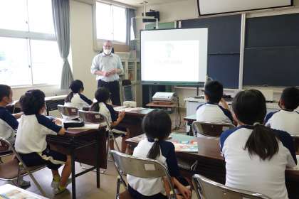 4年生は、筆記用具の言い方をリズムに合わせて学習しました。自然に外国語で筆記用具を話す姿が見られます。
