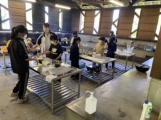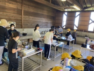 カレーづくりに向けて、材料を切るなどの準備を進めています。