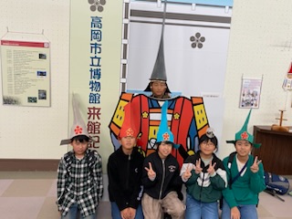 「利長くんの兜をかぶってみよう!」コーナーで記念撮影。