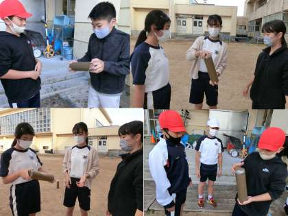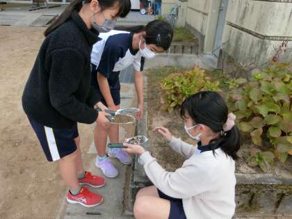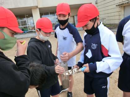 砂場の砂、グラウンドや花だんの土等、粒の大きさや色の違う土や砂を細長いびんに入れ、水を入れてよく振りました。
