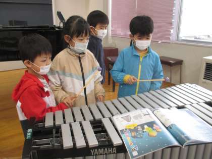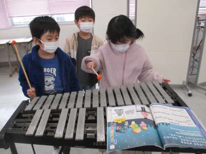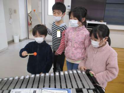音楽科の学習の様子です。「きらきら星」の曲に合わせて楽しく歌った後、鉄琴で演奏ができるようにするため、練習に取り組みました。グループの仲間と音階を一つ一つ確かめ、音の響きを感じながら、楽しく演奏をする子どもの姿が見られました。