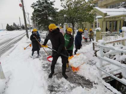 今朝も玄関や正門周り、通学路の歩道をみんなできれいに除雪しました。