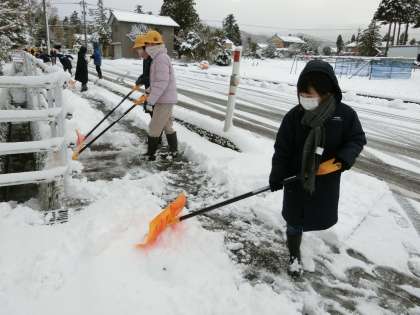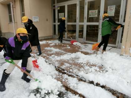 雪が降った朝は、上学年(4〜6年生)の子どもたちは除雪活動に取り組みます。
