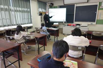 4年生は外国語で学校のいろいろな教室の言い方を学習しました。「まっすぐ進む」「右に曲がる」「左に曲がる」などの進み方の学習では、実際に動いて、楽しく覚えています。