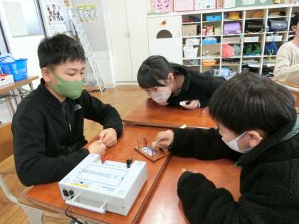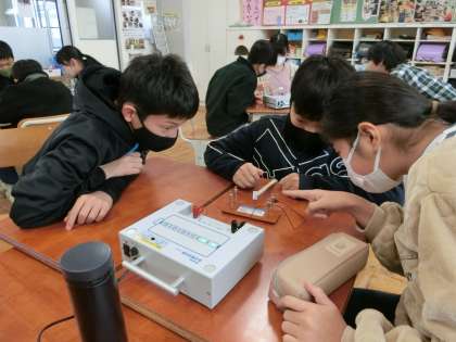6年生は理科の学習で、電源装置を電熱線につなぎ、電熱線に電流を流して発ぽうポリスチレンが切れるか、調べる実験をしました。