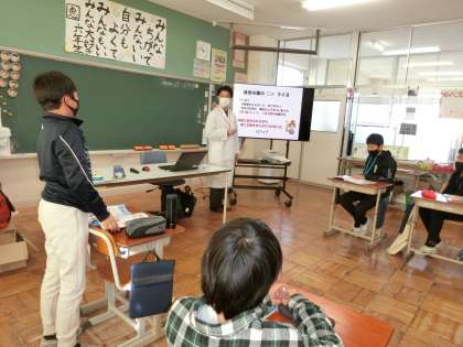 6年生は、学校薬剤師の先生を講師に招き、薬物乱用防止教室を開いて、薬物乱用の害について学習しました。