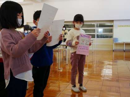 毎日おいしい給食を作ってくださる調理員さんに感謝の気持ちを込めて、各学年から出し物やプレゼントを贈りました。