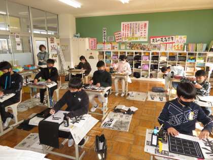 6年間の歩みや、中学校進学への気持ちを毛筆で表現し、今日もまた一歩前進する6年生です。