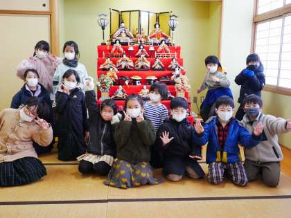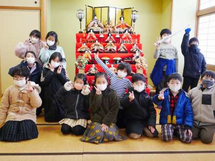 学校のひな人形の前で記念に写真を撮りました。このひな人形は、50年前から学校で大切にされてきたもので、子どもたちに伝えると大変驚きながらも「とてもきれい」「50年もすごいね」と話し合っていました。