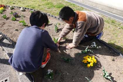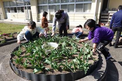 春休みに入る前に少しでも花壇を美しくしておこうと雑草を抜きました。チューリップのつぼみを見付け、春を感じて楽しみながらも、最高学年・高学年として、できることをがんばっています。