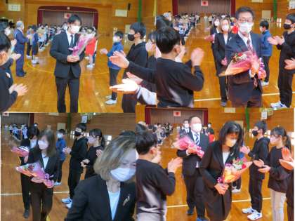 式の終わりには、全校のみんなで校歌を歌い、花道をつくってお見送りしました。