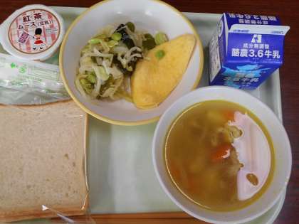 食パン 牛乳 オムレツ 海藻サラダ マルガトーニ(英国風カレースープ) 紅茶ムース