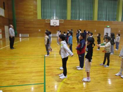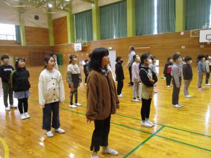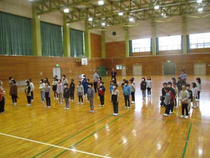 1〜5年生は、朝から体育館で船っ子ハーモニーの時間を楽しみました。少し肌寒い1日の始まりですが、身体をほぐし、元気に「さんぽ」を歌います。