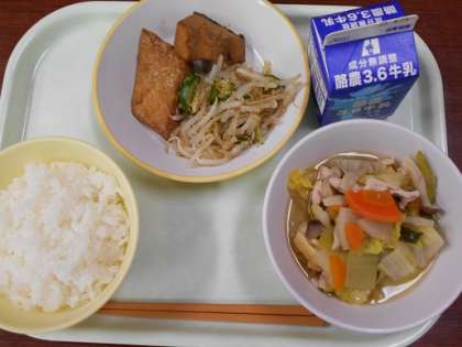 <今日の献立> ごはん 牛乳 ふくらぎの照り焼き ごま酢和え ちゃんこ鍋
