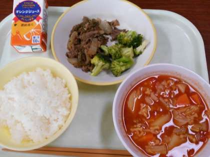ごはん オレンジジュース アメリカンビーフソテー そえ野菜 白いんげん豆のトマト煮