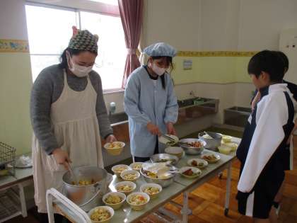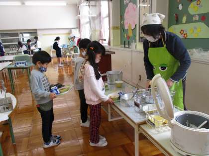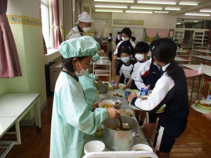 ランチルームでは、各クラスに分かれて給食の配膳をします。順番を守って、てきぱきと行われていました。