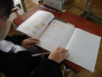 5年生は、立方体や直方体の体積の求め方について学習していました。ノートに丁寧にまとめて理解しようとする姿勢がいいです。