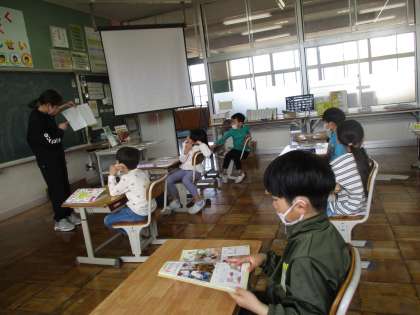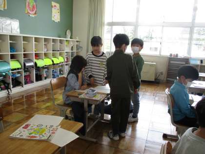 2年生は、どの野菜を育てたいかを考える生活科の学習をしていました。教科書や本、チラシ等を見ながら、自分で育てる野菜を決めるようです。