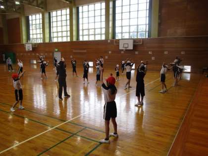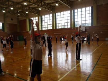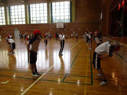今日は、開会式の並び方とラジオ体操の練習を行いました。うでをしっかり伸ばすことを意識して体操しました。