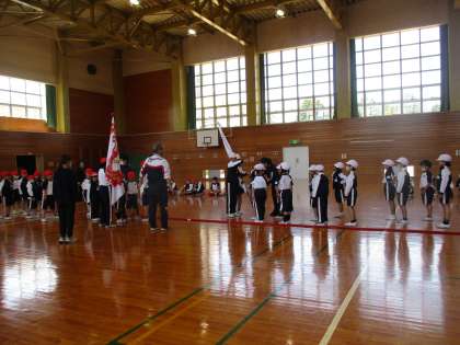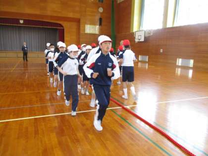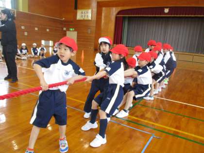 3限に綱引きの練習を行いました。前半は体育館で動きの確認をしました。5・6年生が中心になって、声をかけています。
