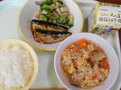 <今日の献立> ごはん 牛乳 いわしのピリ辛煮 ブロッコリーときのこのソテー 卵とじ