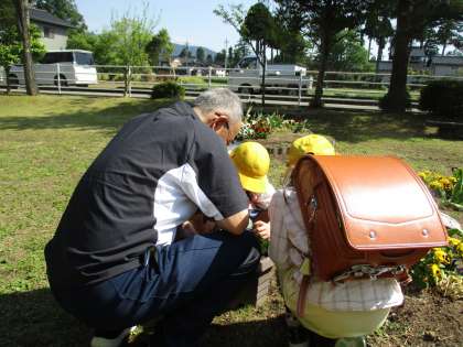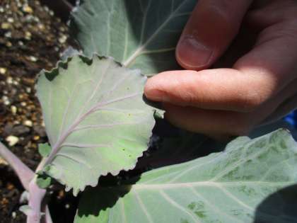 3年生は、1人ずつキャベツをプランターに植えました。そうしたら、キャベツの葉の裏に黄色の1ミリメートルぐらいの点々を見付けました。「モンシロチョウのたまごがある!」と嬉しそうな子どもたちでした。