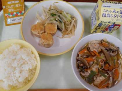 <今日の献立> ごはん 牛乳 にんじんシューマイ おひたし かやくうどん 野菜ふりかけ