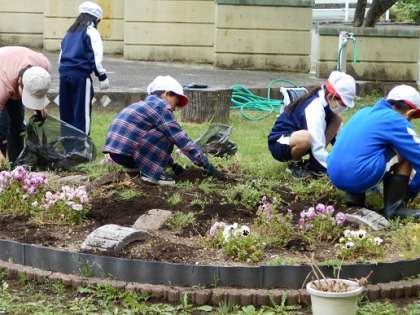 今年度の花壇づくりに向けて、各班が担当する花壇を中心に作業に取り組みました。チューリップは来年度に向けて球根をとり、パンジーは状態を見ながらプランターに植え替えました。