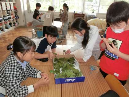 休み時間には、グラウンドから新しい桑の葉を取ってきて、カイコの世話を行う元気もりもり3・4年生です。