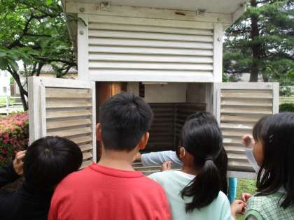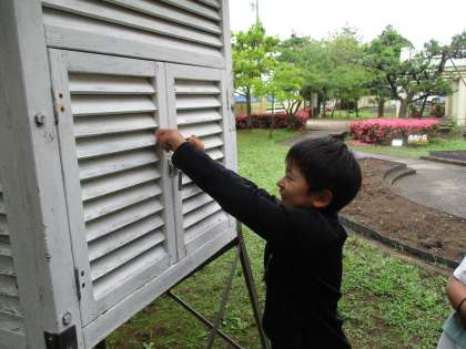 4年生は、理科で「天気と気温」の学習をしています。今日は、学校にある百葉箱を見に行きました。中に入っている温度計の目盛りを読み取り、気温を確認しました。