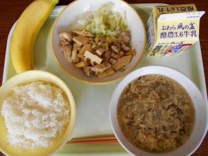 <今日の献立> ごはん 牛乳 あっさりチキン そえ野菜 たまごともずくのスープ バナナ