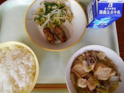 <今日の献立> ごはん 牛乳 ちくわの南部揚げ 甘酢和え すきやき