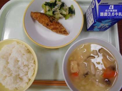 <今日の献立> ごはん 牛乳 魚の竜田揚げ 小松菜ひたし 呉汁
