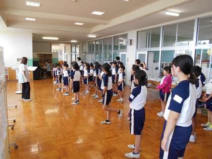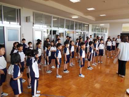 西ワークに集まり、「にじ」を全校で歌いました。声の出し方等について気を付けながら練習しました。