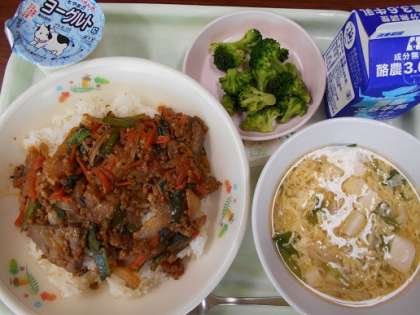 <今日の献立> 麦ごはん 牛乳 もりもりマーボー丼 ゆでブロッコリー かきたま汁 ヨーグルト