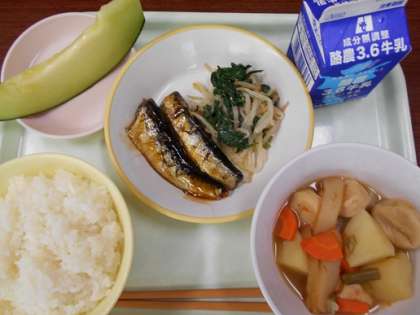 <今日の献立> ごはん 牛乳 いわしの生姜味 ほうれん草のごま和え 関東だき メロン