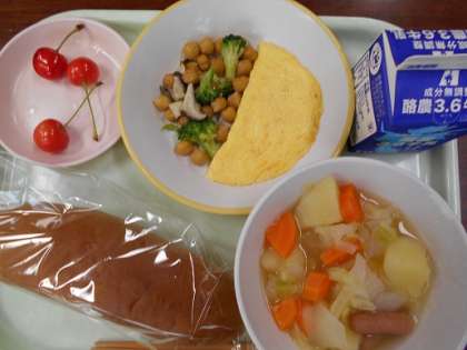 ココアコッペパン  牛乳  チーズオムレツ  きのこと豆のアヒージョ  ポトフ  さくらんぼ