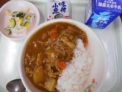 <今日の献立> ごはん 牛乳 カレーライス 大根サラダ 味付け小魚