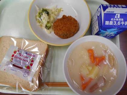 <今日の献立> 食パン 牛乳 メンチカツ グリーンサラダ 白花豆の米粉シチュー いちごジャム