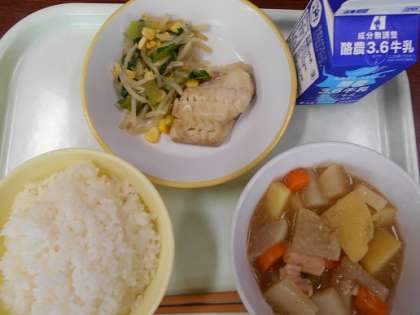ごはん  牛乳  赤魚の塩焼き  チンゲンサイソテー  鶏肉とじゃがいものごま煮