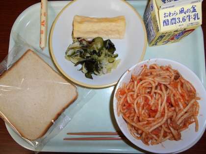 <今日の献立> 食パン 牛乳 ツナとトマトのスパゲッティ たまごロール かいそうサラダ 棒チーズ