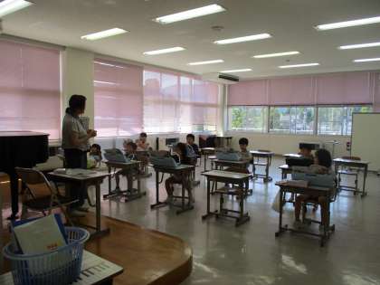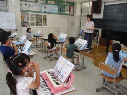 1年生は、音楽室で鍵盤ハーモニカを演奏する学習に取り組んでいました。長い音、短い音、低い音、高い音を聞き比べて、まねをしていました。